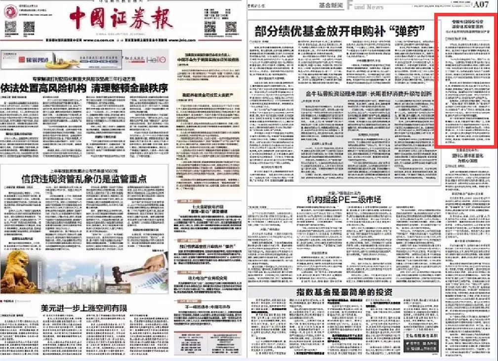7月5日的《中国证券报》第7版刊发题为《安徽省级股权投资基金体系全面落地》的新闻报道。