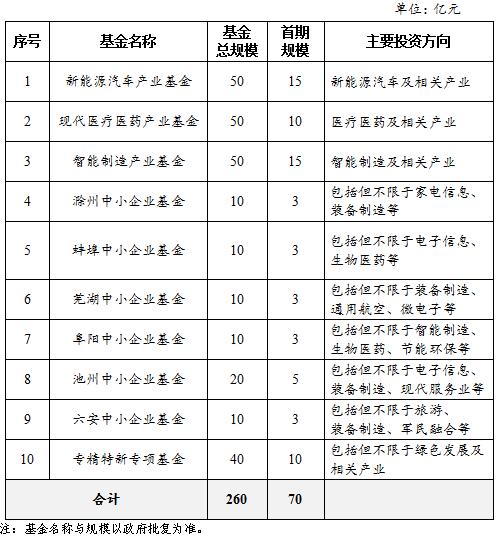 本次拟市场化遴选管理机构的专项基金共10支,包括:新能源汽车产业基金、现代医疗医药产业基金、智能制造产业基金、滁州中小企业基金、蚌埠中小企业基金、芜湖中小企业基金、阜阳中小企业基金、池州中小企业基金、六安中小企业基金、专精特新专项基金。各子基金按基金总规模一次性遴选管理机构,分四期设立。各专项基金规模及主要投资方向如下: